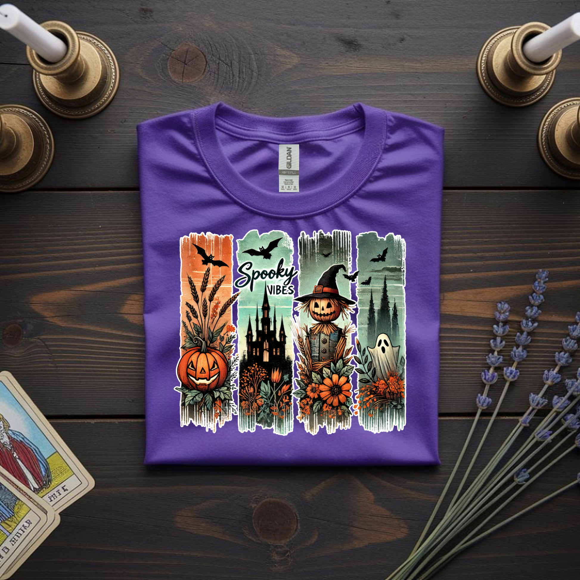 Bring the haunted vibes wherever you go with this “Spooky Vibes” tee. Featuring pumpkins, scarecrows, bats, and a ghostly backdrop, it’s the perfect shirt for October nights, trick-or-treating, or cozy fall fun.