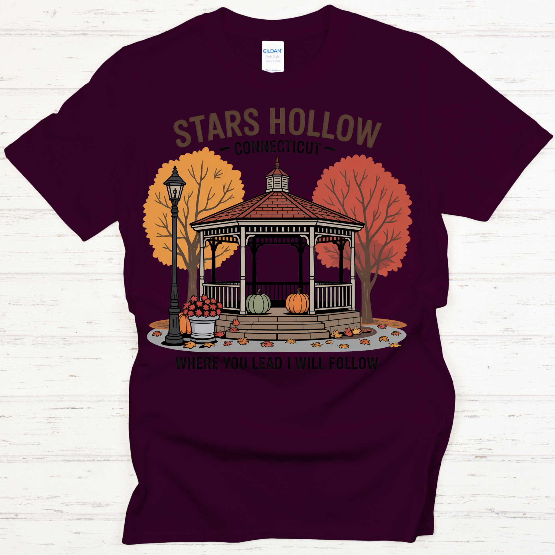 Inspired by Gilmore Girls, this cozy tee features the Stars Hollow gazebo in full autumn bloom. A perfect gift for fans who love fall in Connecticut.